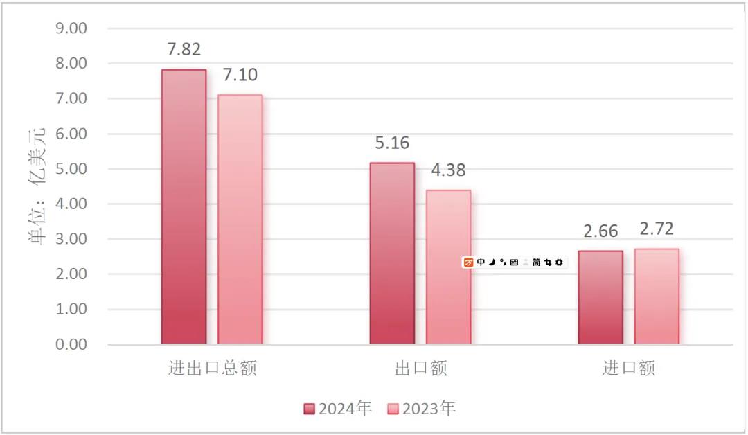 2024年我国花卉进出口贸易额达7.82亿美元,同比增长10.15%。其中出口额5.16亿美元,增长17.78%;进口额2.66亿美元,下降2.16%。10年间进出口总额持续增长,出口态势强劲。