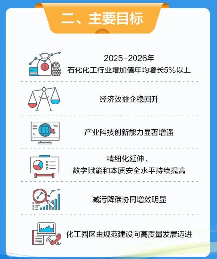 《方案》明确,2025~2026年,石化化工行业增加值年均增长5%以上,经济效益企稳回升,产业科技创新能力显著增强,精细化延伸、数字赋能和本质安全水平持续提高,减污降碳协同增效明显,化工园区由规范建设向高质量发展迈进。这一目标体现了石化化工行业增长的重要性,同时凸显了行业升级的迫切性。