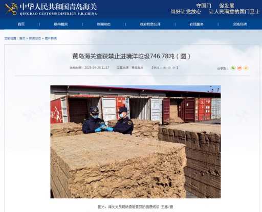 黄岛海关查获禁止进境洋垃圾746.78吨。资料来源:青岛海关官网
