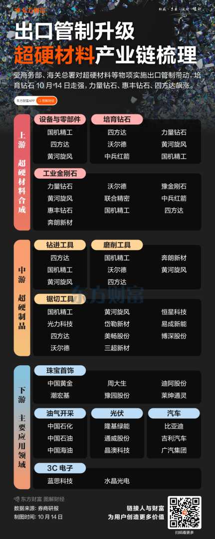 10月14日培育钻石板块表现强势,黄河旋风等涨停。商务部发布超硬材料出口管制公告,中信证券称凸显其战略属性。超硬材料应用广泛,功能性金刚石技术成熟将开拓新蓝海。
