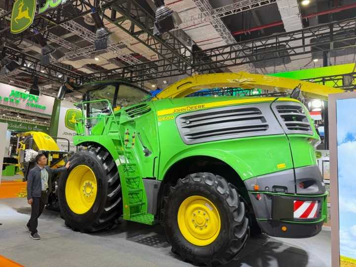 据记者了解,这是约翰迪尔在中国市场推出的最新、最高效的青贮机,最高可达625马力,最高行驶速度为40公里/小时,配备差速锁和自动防滑系统,能提高复杂地况的适应力,是一台灵活的“大块头”。该设备凭借其强大的动力系统与智能监测技术,有效提升了农业机械的作业效率,成为现代农业技术革新的代表。