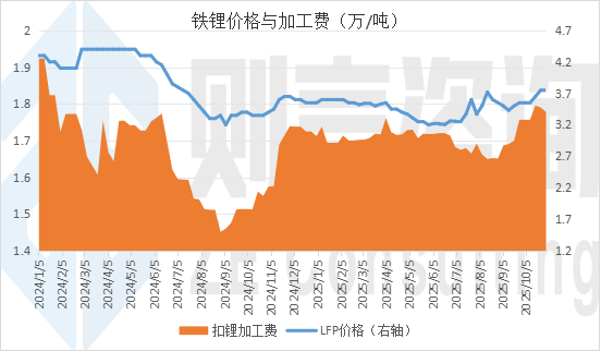经过两年多的价格调整,磷酸铁锂行业在2025年三季度迎来转折点。据行业机构统计,10月下旬动力型磷酸铁锂主流报价已在3.7—3.8万元/吨附近。则言咨询最新10月第5周周报显示,动力型磷酸铁锂价格3.75万元/吨,储能型磷酸铁锂价格3.6万元/吨。扣除锂价影响后,磷酸铁锂企业赚取的加工费自9月起出现一波改善。