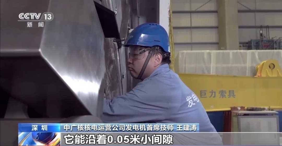中广核核电运营公司发电机首席技师王建涛:发电机抽转子检修是发电机检修中风险最高、工期最长、投入人员最多的工作,要花三四十人连续工作十几个小时,稍微一碰撞造成的经济损失达几亿。小小的机器人可以像孙悟空变成小人一样,它能沿着0.05米小间隙进入发电机完成各种检修和实验,节约大量的检修时间,5个人把工作干完,节约大量的人力。这种智能化的检修方式,无疑将推动核电产业向更高效、更安全的方向发展。