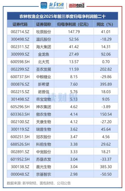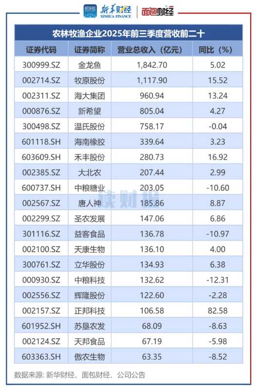 新华财经梳理显示,2025年前三季度A股115家农林牧渔企业营收9556.07亿,归母净利润369.41亿。金龙鱼、牧原股份等营收居前,晓鸣股份等利润增速快,海利生物等毛利率超60%。