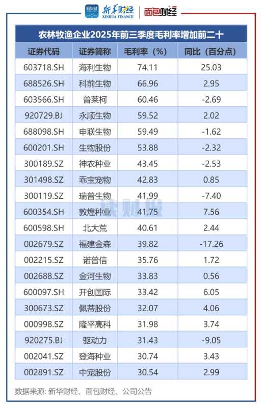 2025年前三季度农林牧渔企业营收利润及毛利率分析