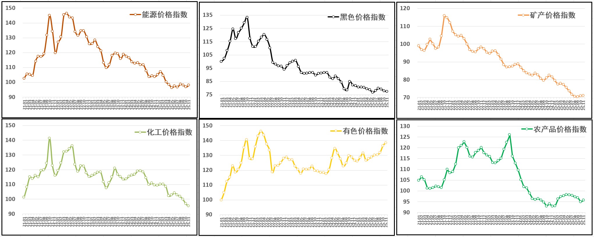 分行业看,得益于全球新能源产业快速发展,以及国内高技术制造业持续保持扩张,有色金属价格指数继续走高,报138.4点,环比上涨1.4%,同比上涨7.5%。受冬季取暖需求季节性增长,以及部分农产品供应偏紧等影响,能源价格指数和农产品价格指数止跌反弹,能源价格指数报97.9点,环比上涨1.2%,同比下跌5.6%;农产品价格指数报95.7点,环比上涨0.9%,同比上涨1.9%。