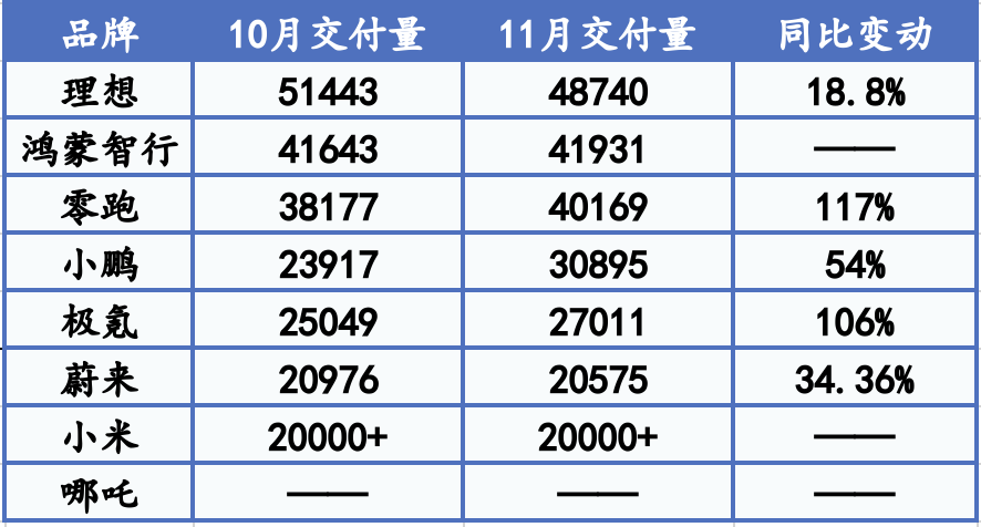 小鹏汽车亦表现不俗,11月交付新车3.09万辆,同比增长54%,环比增长29%,连续3个月刷新单月交付记录。