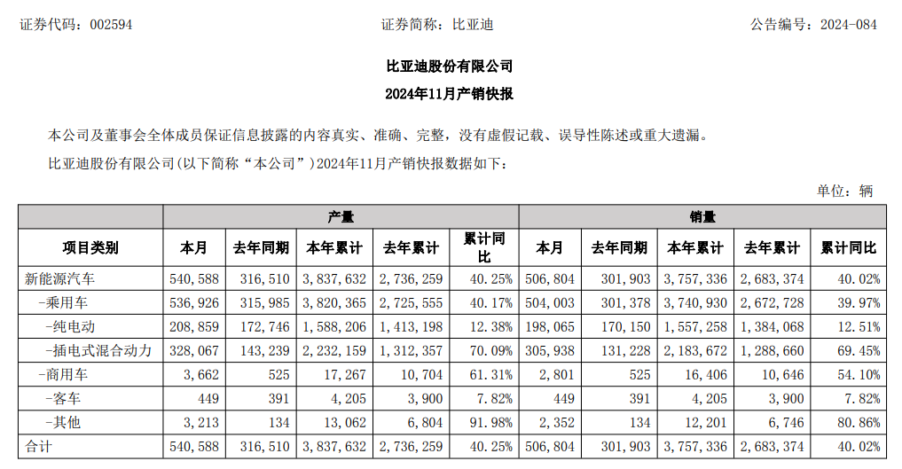 比亚迪公告显示,2024年11月新能源汽车销量达50.68万辆,同比增加显著,本年累计销量同比增加40.02%,彰显了其在新能源汽车领域的领先地位和强劲市场竞争力。