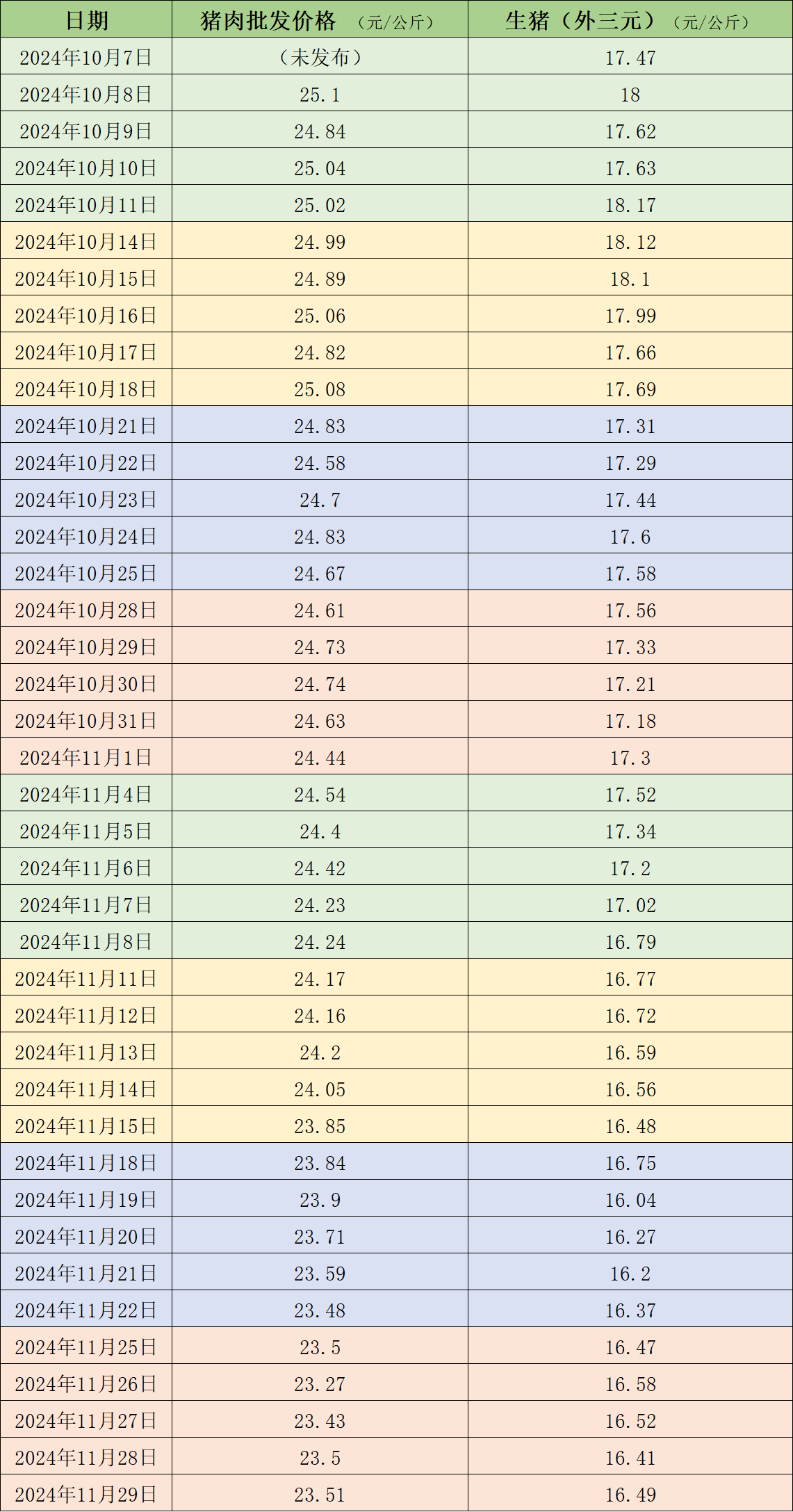 本周国内生猪市场呈现出涨跌互现的趋势,但周均价仍环比上涨。具体来看,11月29日,生猪(外三元)价格为16.49元/公斤,较前一周五的16.37元/公斤上涨0.7%,本周生猪均价为16.49元/公斤,较前一周均价上涨1%。