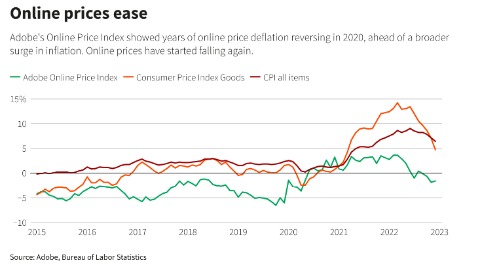 据美国Adobe公司编制的数字价格指数(DPI)显示,美国1月份在线零售商品价格同比下降1%,连续五个月录得同比负增长,为美联储观察到的商品价格回落提供了有力证据。Adobe公司的DPI指数与美国劳工部CPI中的相同类别商品密切相关。