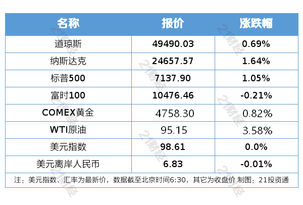 纽约股市三大股指4月22日上涨。截至当天收盘,道琼斯工业平均指数比前一交易日上涨340.65点,收于49490.03点,涨幅为0.69%;标准普尔500种股票指数上涨73.89点,收于7137.90点,涨幅为1.05%;纳斯达克综合指数上涨397.60点,收于24657.57点,涨幅为1.64%。