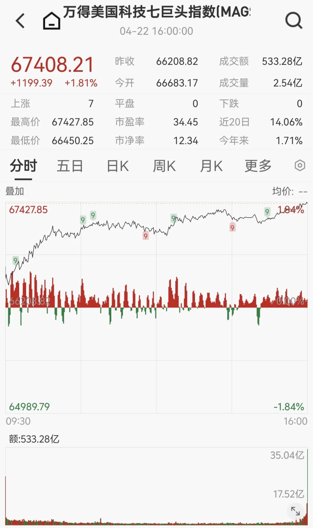 大型科技股集体上涨,万得美国科技七巨头指数涨1.81%。