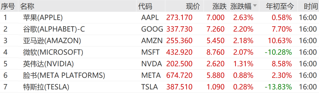 苹果涨2.63%,谷歌涨2.20%,亚马逊涨2.18%,领涨美国科技七巨头。