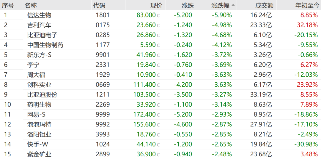 恒生指数成份股中,25只上涨,63只下跌。信达生物重挫5.90%,吉利汽车跌4.98%,比亚迪电子跌4.68%,领跌蓝筹。