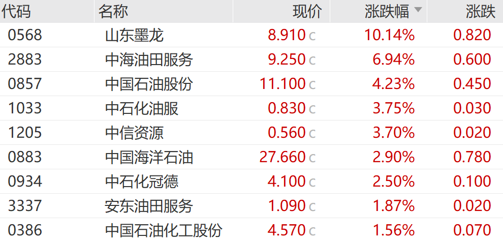 山东墨龙大涨10.14%,中海油田服务大涨6.94%,中国石油股份大涨4.23%,领涨万得石油石化指数成份股。