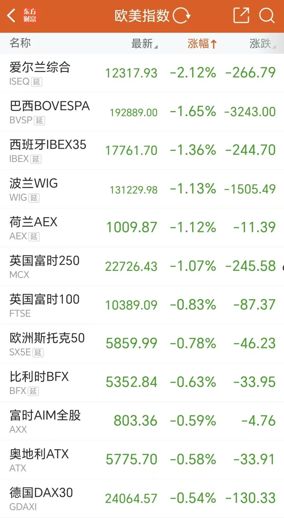 不确定情绪影响下,欧洲股市多数下跌,截至发稿,英国富时100跌超0.8%,欧洲斯托克50指数跌近0.8%,德国DAX30指数跌超0.5%,法国CAC40指数涨0.11%。
