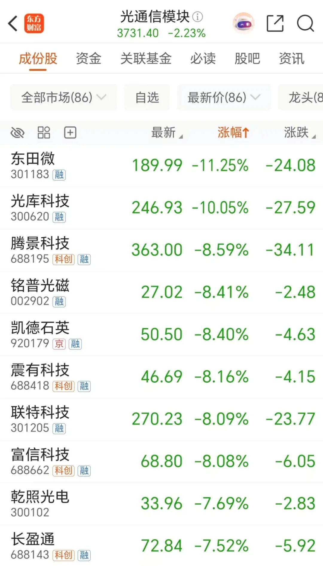 除了外围因素,周四以光模块为首的AI硬件下跌,也引发了市场回调,个股方面,光库科技、赛微电子跌超10%,天孚通信、江波龙等跌超6%,胜宏科技、新易盛等跌超2%,光模块龙头中际旭创逆势涨超1%。