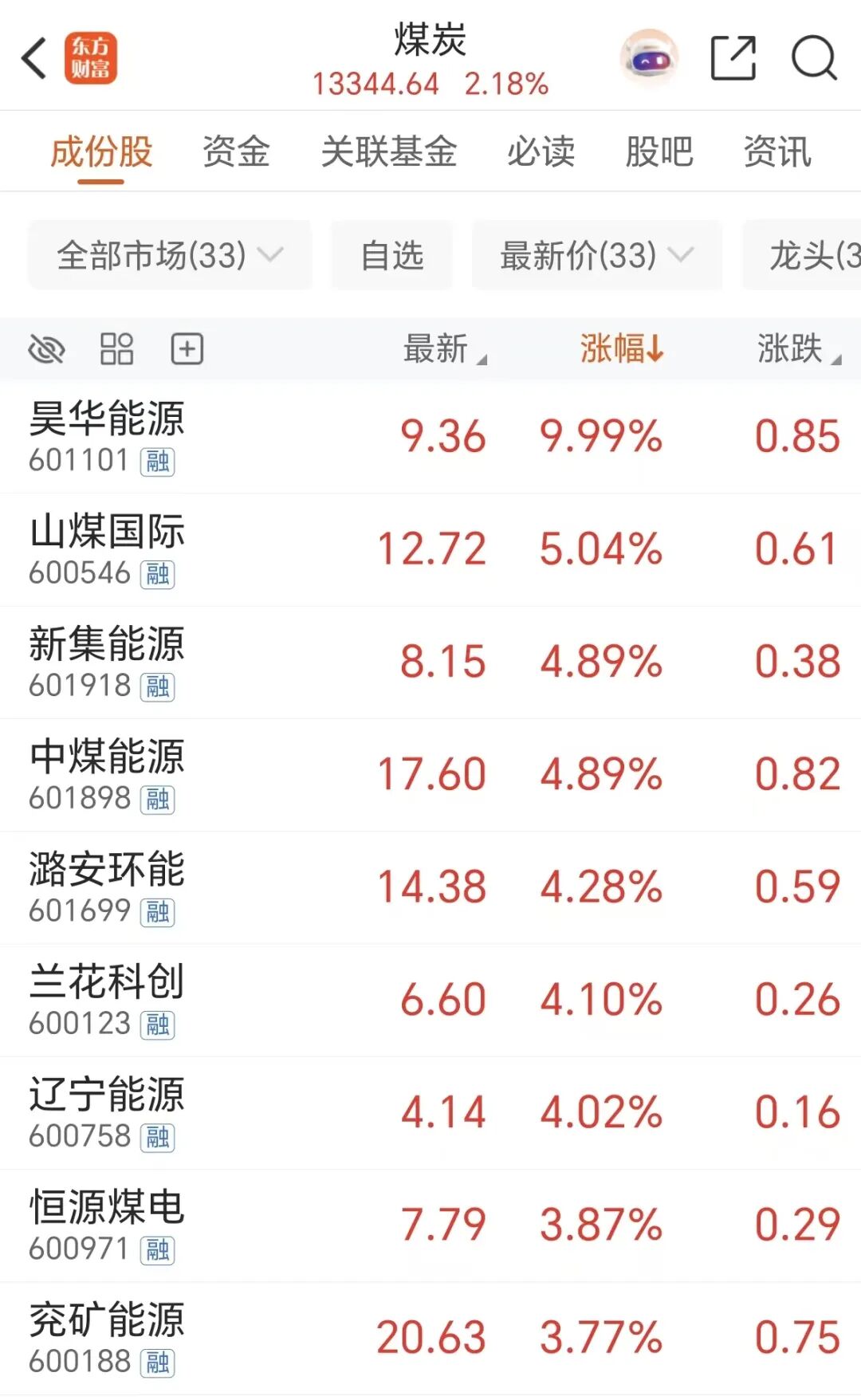 周四煤炭板块逆势大涨超2%,个股方面,昊华能源涨停,山煤国际、中煤能源、潞安环能等个股跟涨。