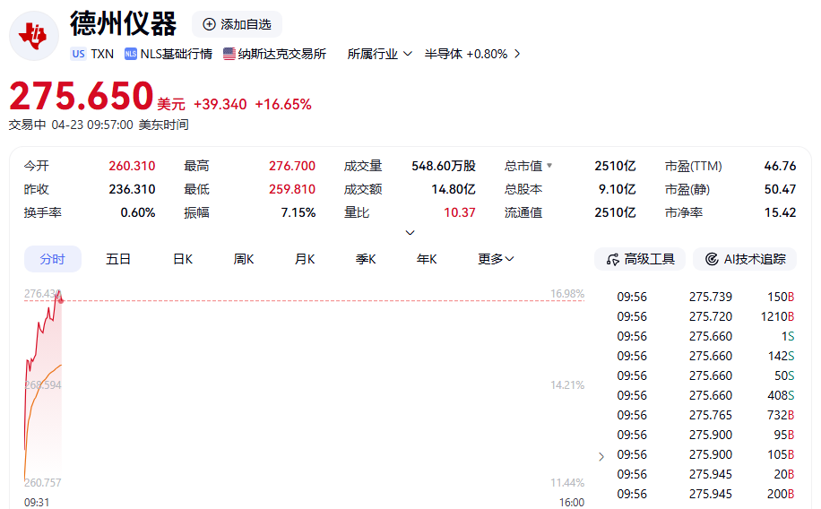 热门个股方面,德州仪器开盘暴涨,截至发