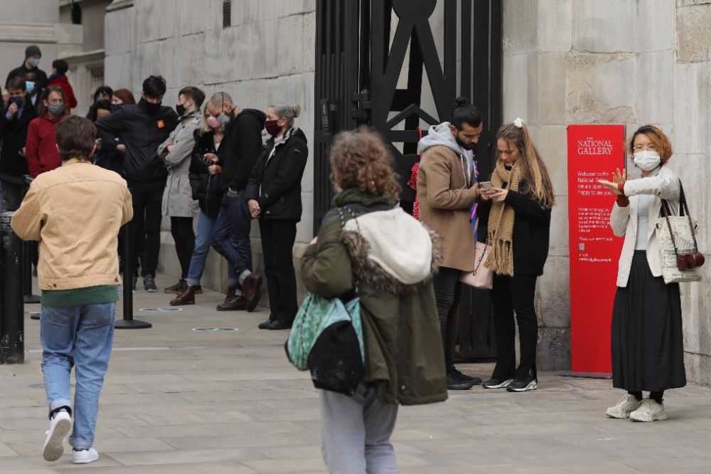 11月1日,英国伦敦国家美术馆外,人们戴着口罩排队等候入场。(新华社发,蒂姆·爱尔兰摄)