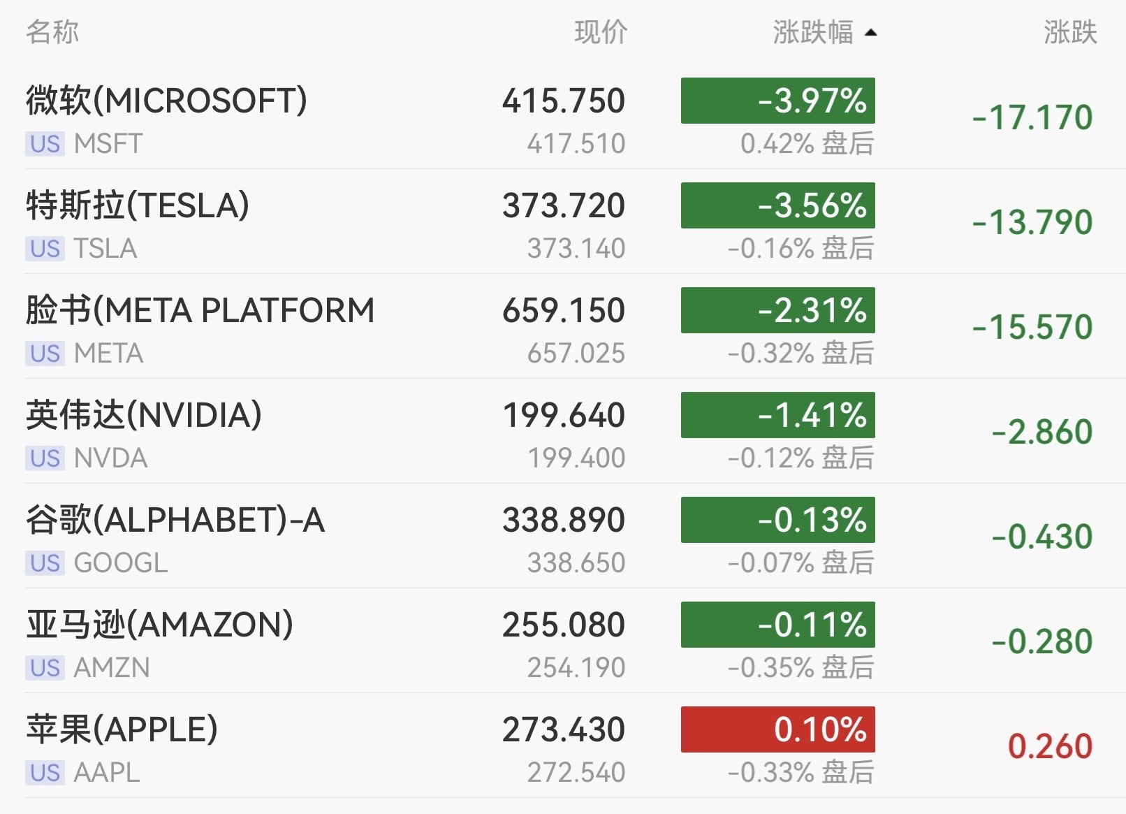 明星科技股普遍下挫,微软跌幅最深,收跌3.97%;特斯拉跌3.56%;英伟达跌1.41%;奈飞跌0.45%;谷歌母公司Alphabet跌0.13%;亚马逊跌0.11%。苹果微涨0.10%。