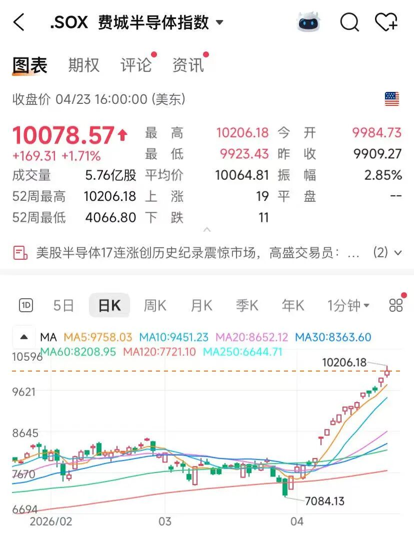 芯片股多数上涨,费城半导体指数涨1.71%,创下十七个交易日连涨的历史纪录,刷新历史新高。