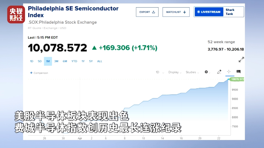 美股半导体板块依旧表现出色,费城半导体指数周四上涨1.71%,连续17个交易日上涨,创历史最长连涨纪录。当天主要受到美国芯片制造商德州仪器一季度利好财报的提振,公司股价大涨超19%,也是近26年来的最大单日涨幅。