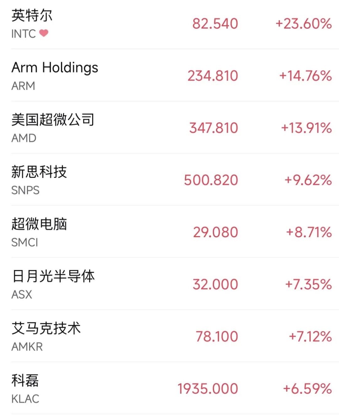 Arm Holdings涨超14%,美国超微公司涨近14%,超微电脑涨超8%,日月光半导体涨超7%。
