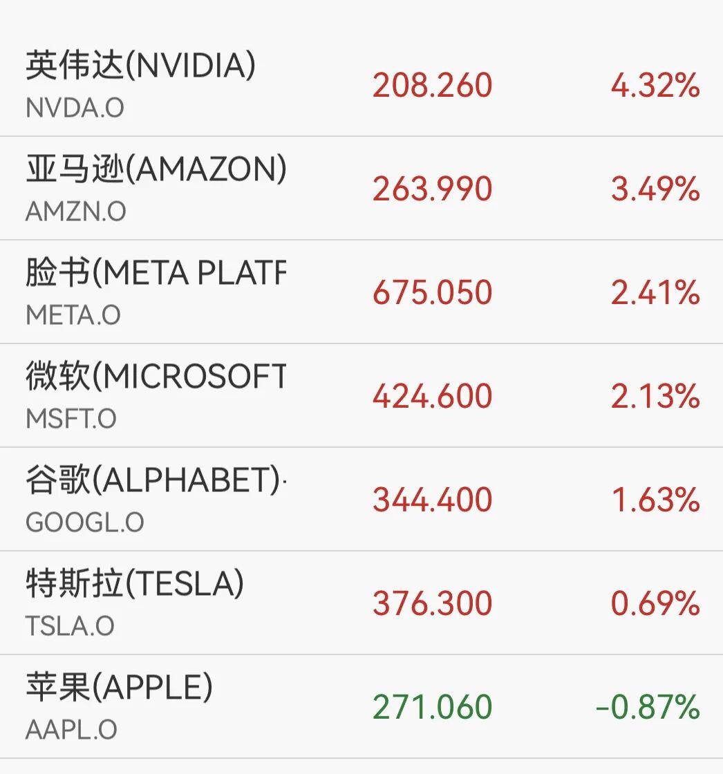 截至收盘,英伟达涨4.32%,亚马逊涨3.49%,微软涨2.13%,Meta涨2.41%,谷歌涨1.63%,仅苹果跌0.87%。