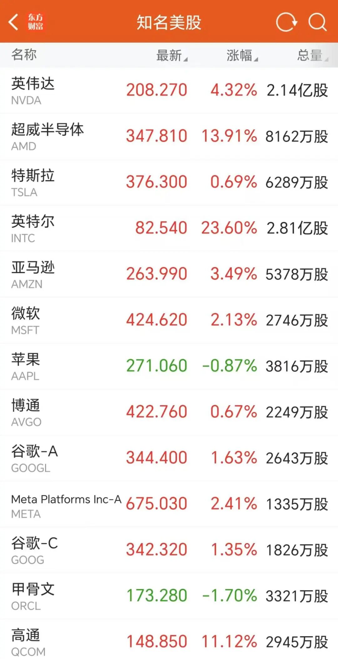 大型科技股普涨,亚马逊涨超3%、股价创新高,微软、Meta涨超2%,谷歌涨超1%,特斯拉跟涨,奈飞、苹果小幅下跌。芯片股方面,英特尔涨超23%,Arm涨逾14%,AMD涨超13%,三者股价均创新高,高通涨超11%,超微电脑涨逾8%,英伟达涨超4%、总市值重返5万亿美元之上。存储概念股表现分化,闪迪涨逾6%,美光科技涨超3%,两者股价创新高,西部数据微涨,希捷科技微跌。