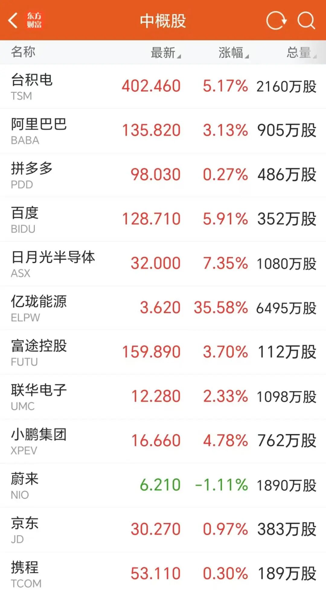 热门中概股普涨,纳斯达克中国金龙指数涨1.59%,百度涨近6%,小鹏集团、万国数据、网易有道涨超4%,名创优品、阿里巴巴涨超3%,贝壳、京东、网易跟涨。金山云跌超3%,理想汽车、爱奇艺跌超2%,蔚来跌超1%。
