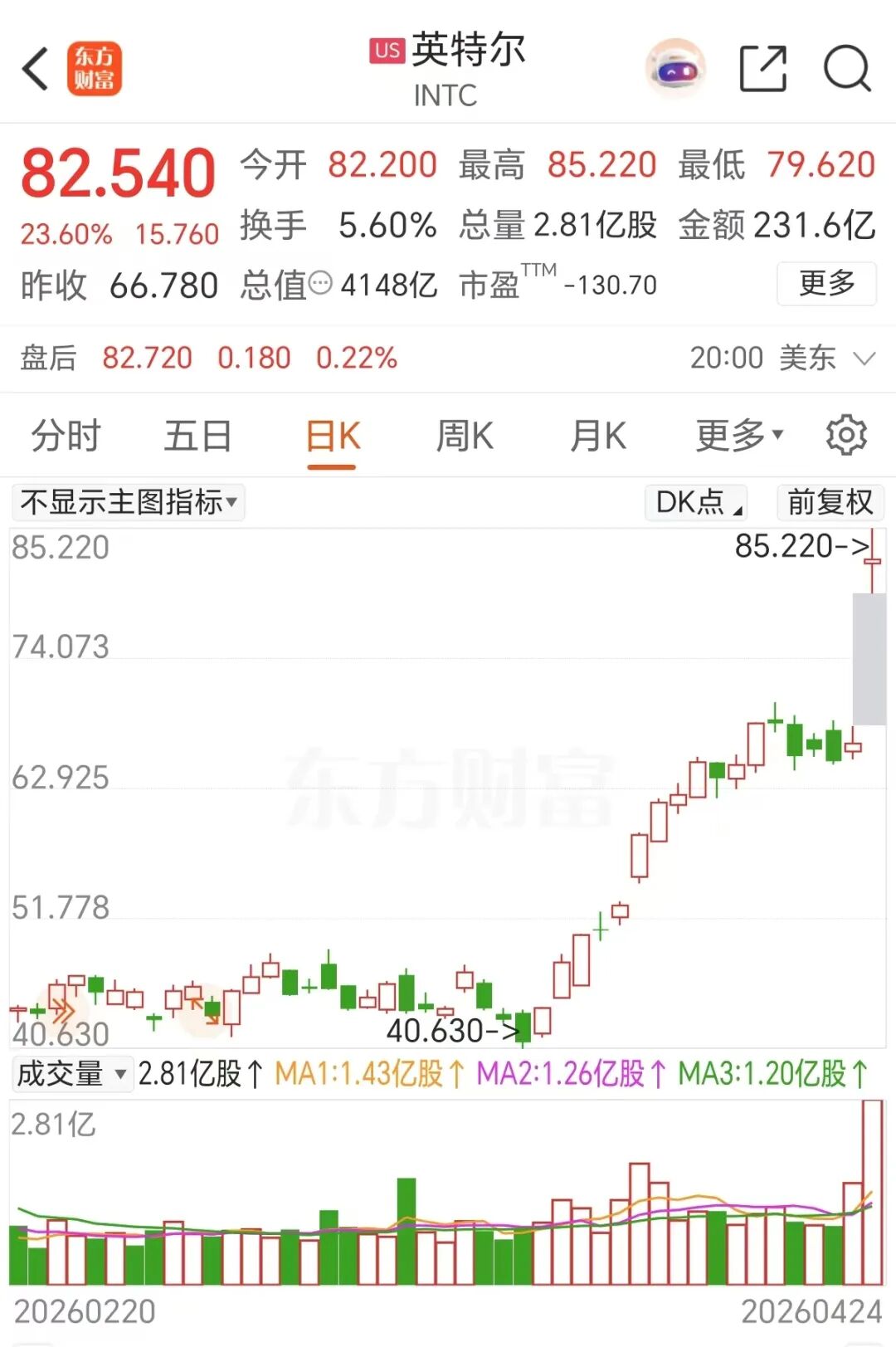 周五英特尔收盘暴涨超23%,创出历史新高,并成为标普500指数中表现最佳个股,虽然该公司净利仍亏损,但给出的一季报营收表现与第二季度业绩指引超出市场预期。