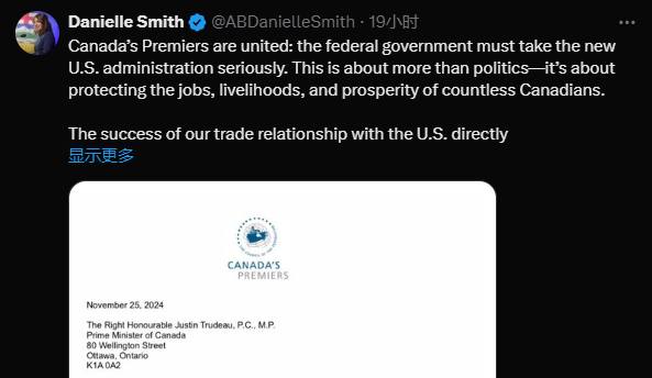 加拿大石油生产商协会还表示,特朗普的威胁可能会让加拿大总理特鲁多重新考虑先前提出的油气业大幅减排方案。他们认为该方案会扼杀加拿大GDP和就业的最大创造者。与此同时,加拿大阿尔伯塔省省长丹妮尔·史密斯也在社交媒体上表示支持特朗普政府的担忧,并呼吁加拿大政府与即将上任的美国政府合作解决边境问题,避免关税的实施。