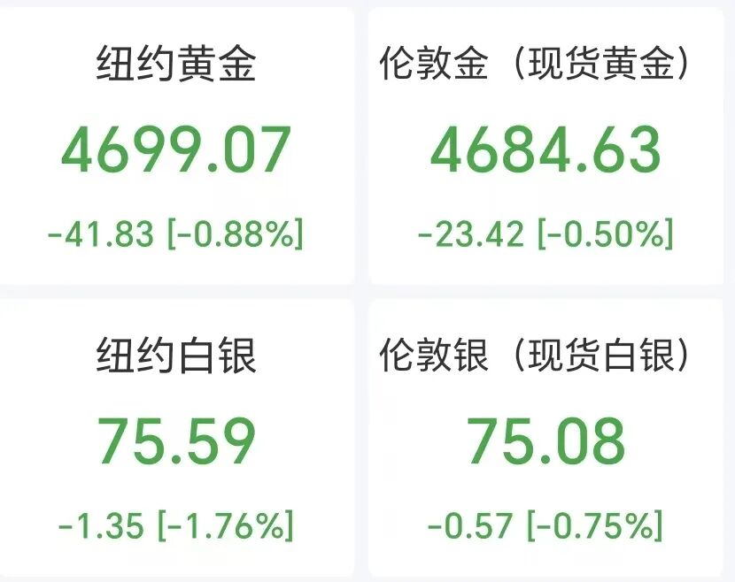 贵金属集体下跌。现货黄金失守4690美元/盎司,日内跌0.5%,纽约期金失守4700美元
