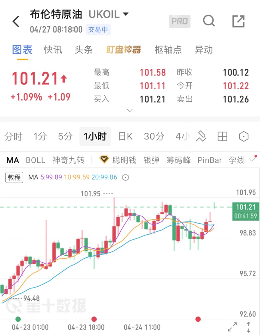布伦特原油日涨幅一度达1.43%,最高报101.58美元/桶,升破101美元/桶。纽约原油期货暗盘直线拉升。