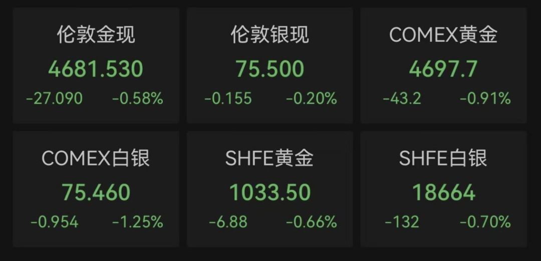 截至北京时间4月28日5:40,伦敦金现下跌0.58%,报4681.53美元/盎司;COMEX黄金期货下跌0.91%,报4697.7美元/盎司。伦敦银现下跌0.2%,报75.5美元/盎司;COMEX白银期货下跌1.25%,报75.46美元/盎司。