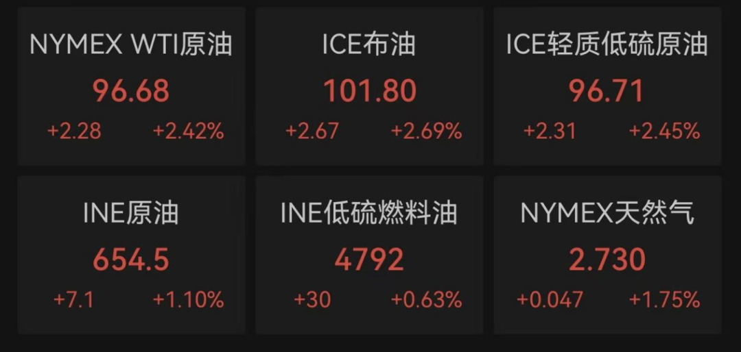 国际原油期货价格持续回升。截至北京时间4月28日5:40,NYMEX WTI原油期货主力合约上涨2.42%,报96.68美元/桶;ICE布油期货主力合约上涨2.69%,报101.80美元/桶。