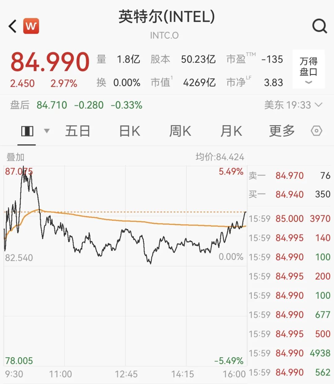 英特尔收涨2.97%,同样创历史新高,最新总市值为4269亿美元。