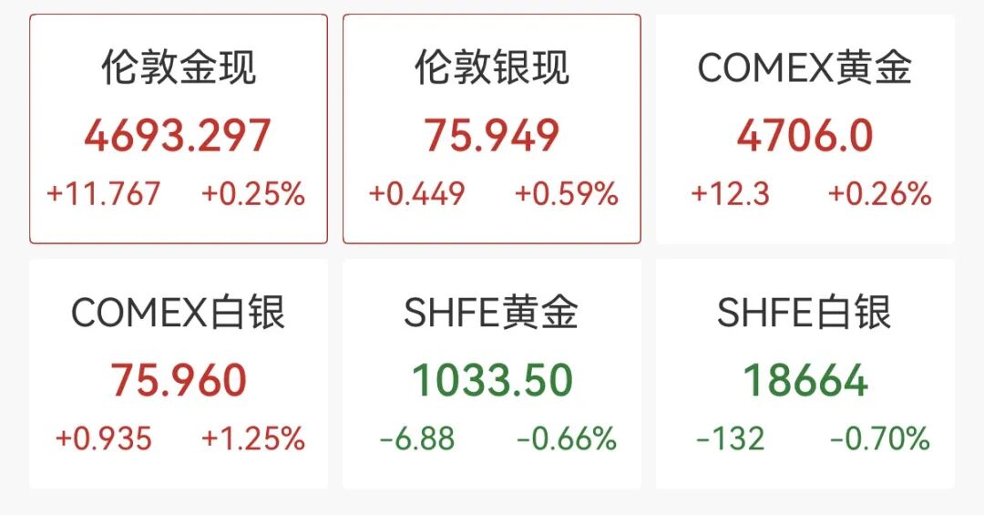 美东时间4月27日,黄金震荡下跌。黄金美股收盘时跌破4700美元,但截至发稿时略微上涨。伦敦金现涨0.25%,报4693.297美元/盎司;COMEX黄金期货涨0.26%,报4706美元/盎司。