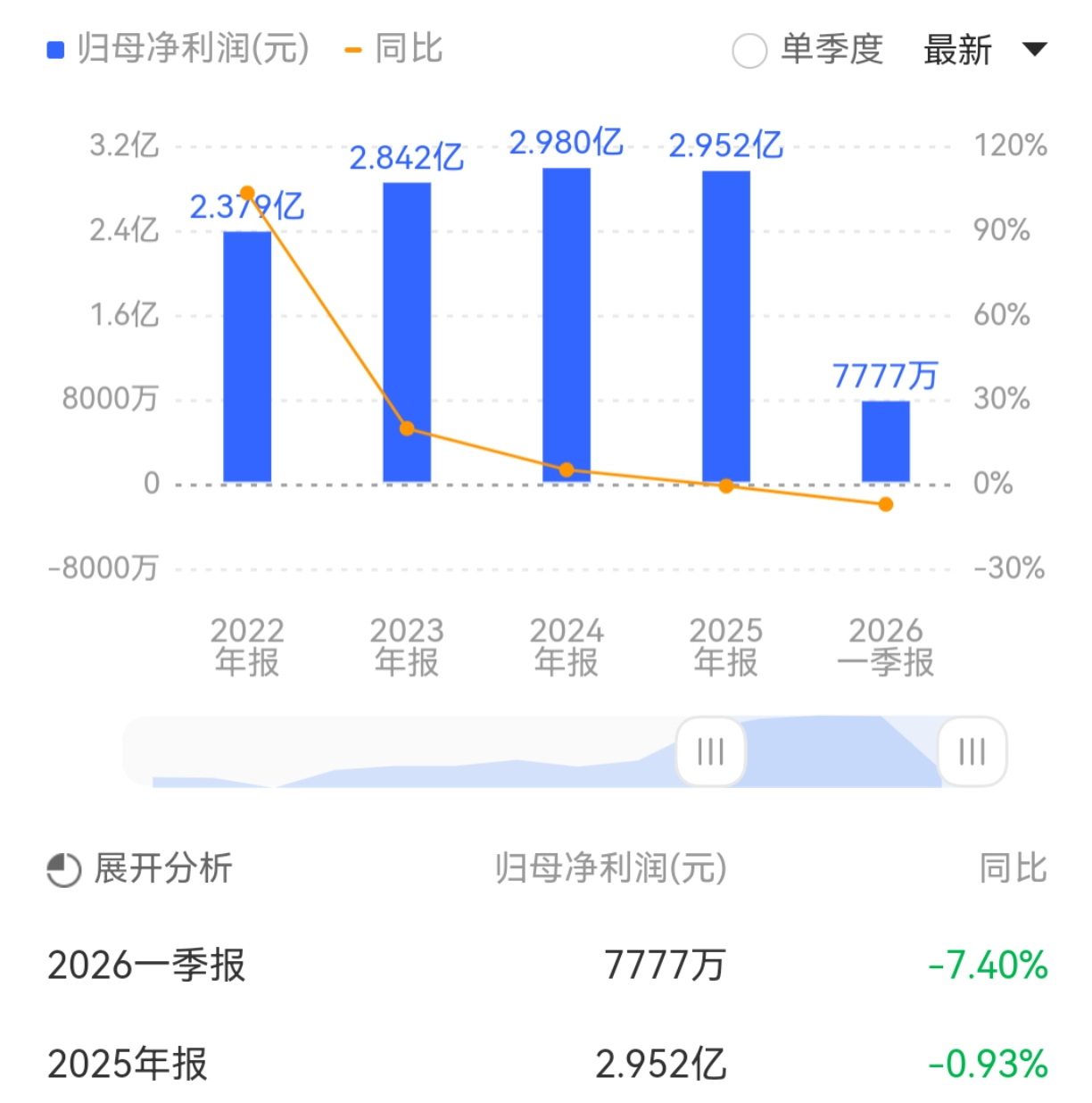 2026年一季度,公司实现营业总收入11.08亿元,同比增长23.99%;归母净利润为7776.75万,同比下降7.40%;扣非净利润为6749.93万元,同比下降10.91%。