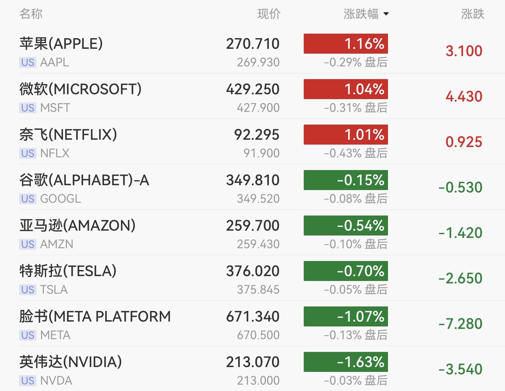 龙头科技股涨跌不一。苹果收涨1.16%;微软涨1.04%;奈飞涨1.01%。下跌阵营中,英伟达收跌1.63%,Meta跌1.07%,特斯拉跌0.70%,亚马逊跌0.52%,谷歌母公司Alphabet跌0.15%。