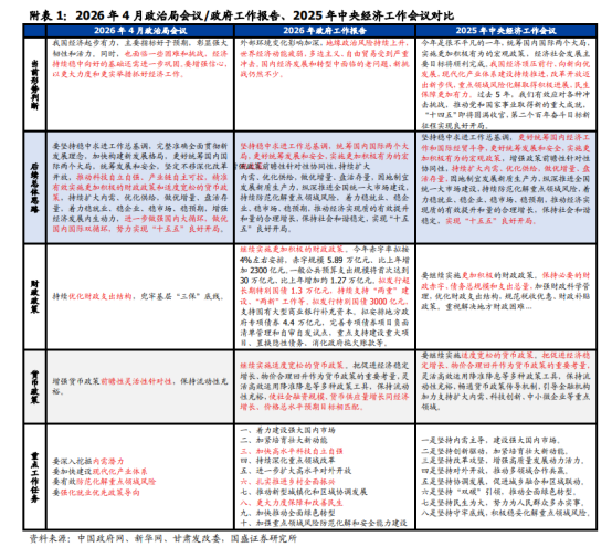 总体来看,4月政治局会议释放的信号包括三部分:第一,经济好于预期,但政策仍需努力。第二,宏观政策落脚点是用好用足既有政策。财政政策的侧重点从赤字和债务额度转向支出结构优化,货币政策没有直接重提降准降息,而是强调前瞻性、灵活性、针对性和流动性充裕。第三,政策更加重视内生动力和安全底线。内需方面强调供给改善、民生服务、“六网”建设和重大工程开工;外部方面强调系统应对冲击和能源资源安全;产业方面强调反内卷、AI+和制造业合理比重。相比2025年4月的“应对关税冲击”,在外部不确定性常态化下,当前更侧重修复国内循环和产业秩序。