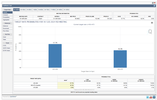 美联储自9月以来已降息75个基点,但关税导致的通胀重新抬头可能会给其降息之路带来阻碍。近期,交易员对美联储未来的降息预期有所降低,但尚不清楚这是受美国经济韧性影响,还是选举结果所致。CME的FedWatch工具显示,美联储12月份降息25个基点的概率为57.7%,维持利率不变的概率为42.3%。