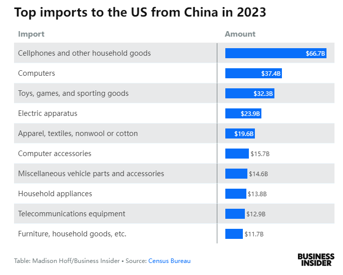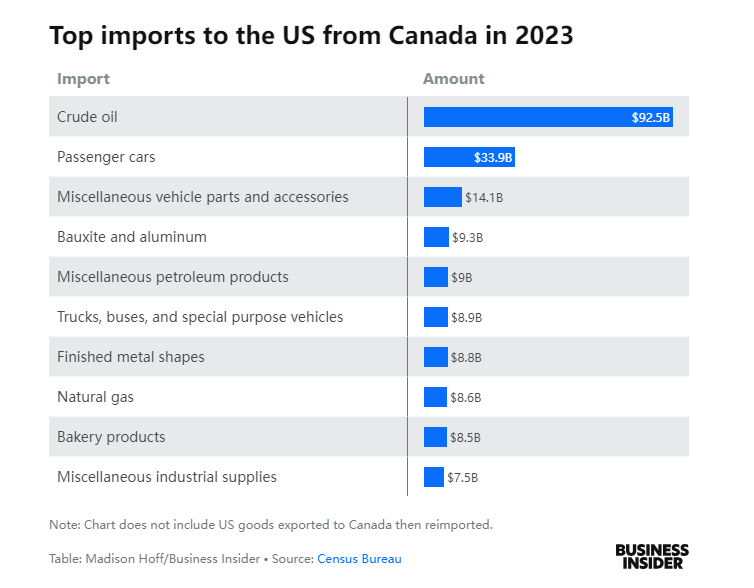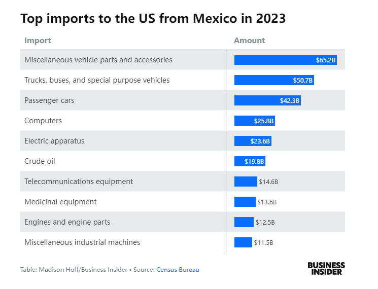 具体而言,美国自加拿大进口的主要商品包括原油、乘用车及天然气;自墨西哥进口则以汽车零部件、计算机设备及原油为主;而中国则是美国电子产品的主要供应国,包括手机、计算机设备及游戏、玩具等。