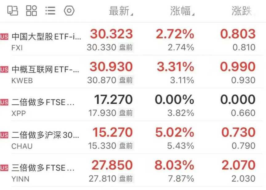 在凌晨的交易中,纳斯达克中国金龙指数收涨2.81%,中概互联网指数ETF、中国科技指数ETF等也均收涨。热门中概股继续上涨势头,高途、爱奇艺等个股涨幅领先。