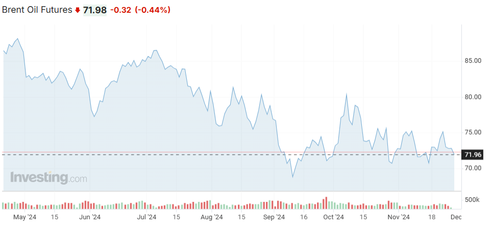 自7月初以来,原油期货已经下跌了17%。周四(11月28日),布伦特原油期货的交易价格已经跌至每桶72美元,显示出市场对供应过剩的担忧。