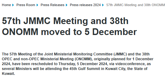 当地时间周四(11月28日),维也纳总部的石油输出国组织(欧佩克)宣布,原定于2024年12月1日举行的联合部长级监督委员会(JMMC)第57次会议与欧佩克和非欧佩克产油国部长级会议(ONOMM)第38次会议,将延后四天至下周四(2024年12月5日)以视频会议形式举行。