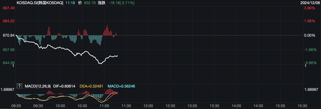 韩国金融市场12月6日早间再度遭遇剧烈震荡,韩元兑美元汇率急剧下跌,同时韩国KOSDAQ指数也一度逼近4%的跌幅。
