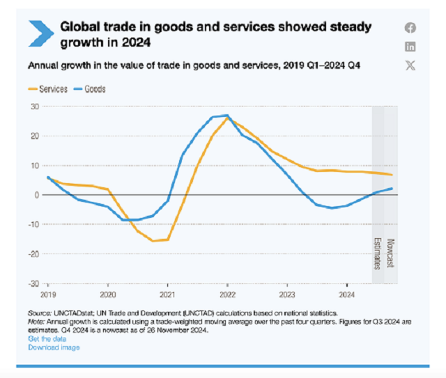 UNCTAD指出,2024年服务贸易已成为全球贸易增长的主要引擎,增速高达7%,占据了全球贸易增长份额的一半以上。相比之下,商品贸易增速仅为2%,尚未恢复至2022年的峰值水平。