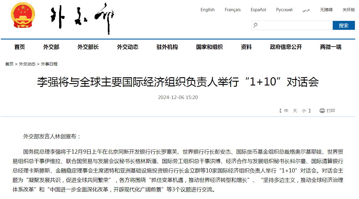 国务院总理李强将于12月9日上午在北京,与来自新开发银行、世界银行、国际货币基金组织、世界贸易组织、联合国贸易与发展会议、国际劳工组织、经济合作与发展组织、国际清算银行、金融稳定理事会和亚洲基础设施投资银行等10家国际经济组织的负责人,共同举行一场盛大的“1+10”对话会。对话会的主题定为“凝聚发展共识,促进全球共同繁荣”。